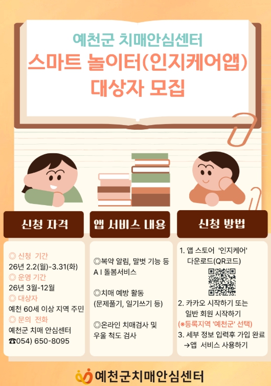 한편, 신규 가입자를 독려하기 위해 3월 한 달간 앱 내에서 ‘일기 쓰기’를 10회 이상 작성한 참여자에게는 편의점 5천 원 쿠폰을 증정하는 특별 챌린지를 진행할 예정이며, 사업과 관련한 자세한 문의는 예천군 치매안심센터로 하면 된다.