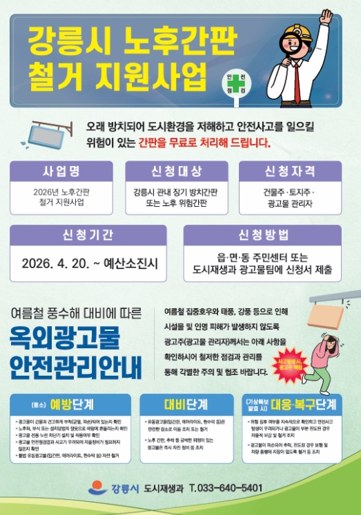 [뉴스앤톡] 강릉시는 안전사고를 예방하고 쾌적한 도시환경을 조성해 주민 만족도를 높이고자 '2026년 노후간판 철거 지원사업'을 시행한다.