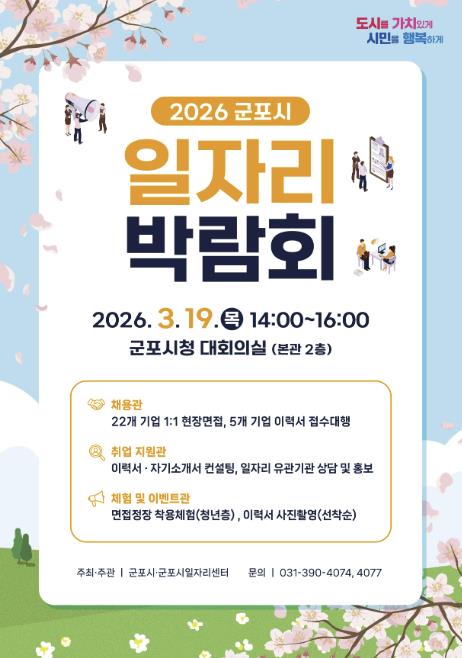 [뉴스앤톡] 군포시는 오는 3월 19일 오후 2시부터 시청 대회의실에서 ‘2026년 군포시 일자리 박람회’를 개최한다. 이번 박람회는 지역 내 우수 기업과 구직자가 직접 만나는 채용의 장으로 제조, 서비스, 물류배송, 의료복지 등 다양한 분야에서 폭넓은 취업 기회를 제공할 예정이다.