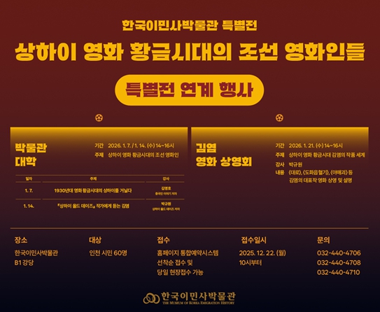 [뉴스앤톡] 인천광역시 시립박물관 분관 한국이민사박물관은 특별전 〈상하이 영화 황금시대의 조선 영화인들〉과 연계해 유명 작가 초청 특강을 개최한다고 밝혔다.