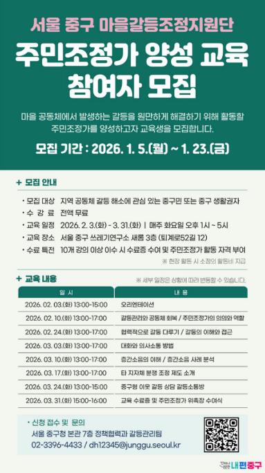 [뉴스앤톡] 서울 중구가 주민 스스로 갈등을 조정하고 마을의 신뢰를 회복할 수 있도록 돕는 ‘주민조정가’를 양성해 따뜻한 공동체 문화를 만들어가고 있다. 구는 2024년 마을갈등조정지원단 제1기 주민조정가에 이어, ‘제2기 주민조정가 신규 양성 교육’에 참여할 교육생을 공개 모집한다.