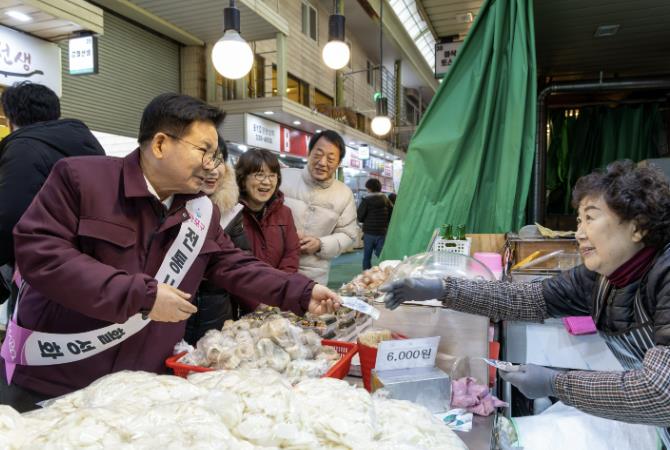 | ▲ 설 명절맞이 망원시장을 방문한 박강수 마포구청장 |
