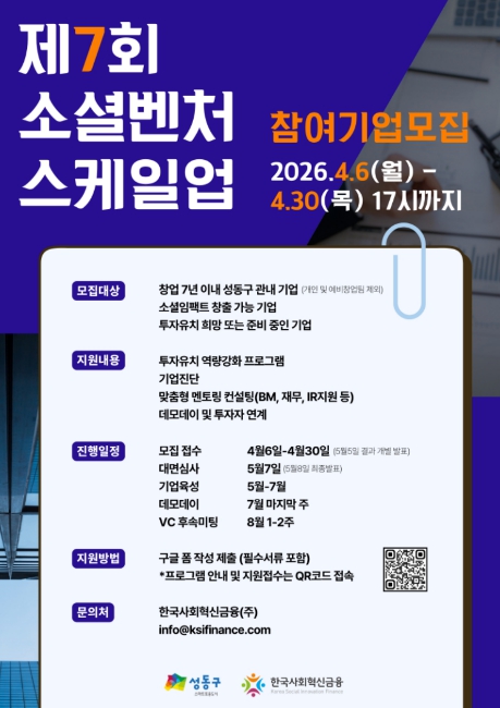 [뉴스앤톡] 서울 성동구는 관내 소셜벤처기업을 대상으로 투자 유치 역량 강화를 위해 2026년 제7회 소셜벤처 스케일업 프로그램 참여기업을 모집한다고 밝혔다.