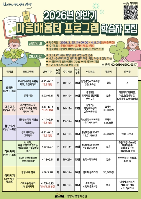 [뉴스앤톡] 광명시가 시민들이 생활권 내에서 평생학습을 누릴 수 있도록 ‘2026년 상반기 권역별 마을배움터 프로그램’ 수강생을 오는 4월 8일까지 모집한다.