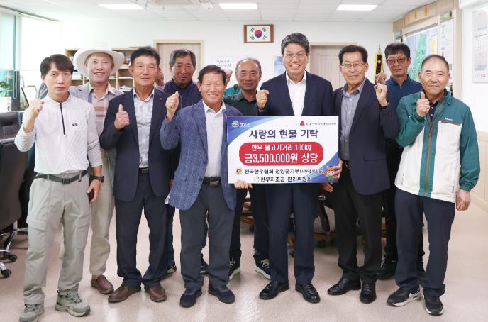 [뉴스앤톡] 청양군은 전국한우협회 청양군지부 한우자조금관리위원회가 추석 명절을 앞둔 지난 29일 한우 불고기거리 100kg(350만원 상당)을 기탁하며 이웃사랑을 실천했다고 밝혔다.