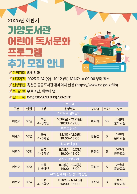 [뉴스앤톡] 옥천 가양도서관은 군민의 독서문화활동을 지원하기 위해 하반기 어린이 독서문화프로그램 수강생을 추가 모집한다.