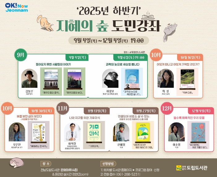 독서문화 행사의 경우 ‘제253회 지혜의 숲 도민강좌’가 연말까지 운영된다. 하반기 첫 강연은 9월 4일 김동우 사진작가를 초청, ‘돌아오지 못한 사람들의 이야기’를 주제로 광복 80주년을 맞아 잊힌 국외 독립운동 사적지의 사진과 함께 잘 알려지지 않은 독립운동사를 소개한다.