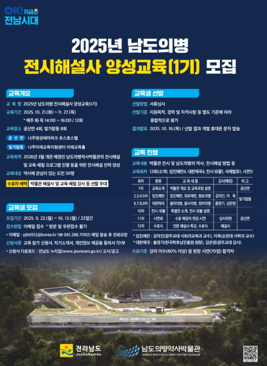 [뉴스앤톡] 전라남도는 2026년 3월 개관 예정인 남도의병역사박물관에서 활동할 전시해설사와 교육·체험 강사 양성을 위해 오는 10월 13일까지 교육생 30명을 모집한다고 밝혔다.