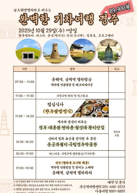 ‘완벽한 기차여행 경주’ 상품과 관련한 자세한 내용과 상품 예약은 부산역 여행센터 및 관련 여행사 ㈜다올여행 또는 네이버 스마트스토어를 통해 확인할 수 있다.