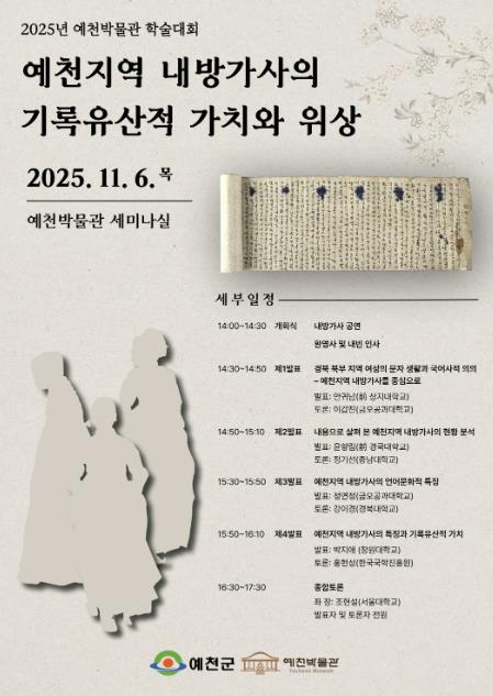 [뉴스앤톡] 예천군 예천박물관은 11월 6일 오후 2시 ‘예천지역 내방가사의 기록유산적 가치와 위상’이란 주제로 학술대회를 개최한다.