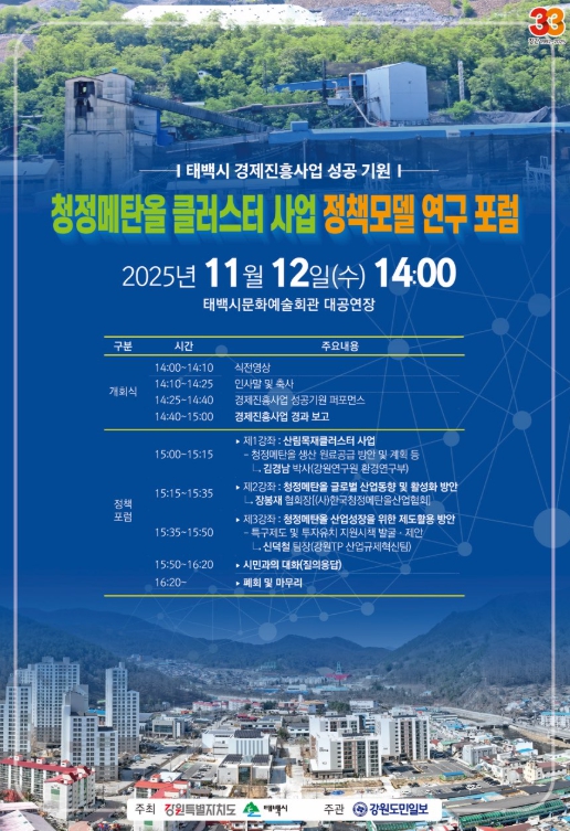 [뉴스앤톡] 태백시는 오는 11월 12일 오후 2시 강원특별자치도와 공동으로 추진하는 ‘2025 국제 폐광지역 경제포럼’ 연계행사인 ‘청정메탄올 클러스터 사업 정책모델 연구 포럼’을 문화예술회관 대공연장에서 개최한다고 밝혔다.