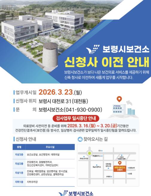 다만 의료장비 이전 및 설치 작업으로 인해 3월 16일부터 20일까지 건강진단결과서(보건증) 발급을 포함한 방사선 및 임상병리 검사 등 일부 업무가 일시 중단되며, 검사 관련 민원 처리가 제한될 수 있어 시민들의 양해를 당부했다.