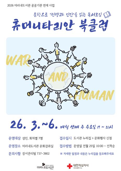 ‘전쟁과 인간’을 주제로 3월부터 6월까지, 매월 셋째 주 수요일 오후 7시부터 2시간 동안 운영될 예정이다. 프로그램은 선정 도서를 사전에 읽은 뒤 질문지를 바탕으로 토론하는 방식으로 진행된다.