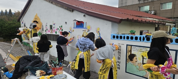 | ▲ 2025년도 선정 과제인 “온 마을이 함께하는 라라라 프로젝트”와 관련, 도시 미관 개선 및 마을 활력 부여를 위해 장유 무계마을의 노후화 된 벽화를 꾸미는 모습 |