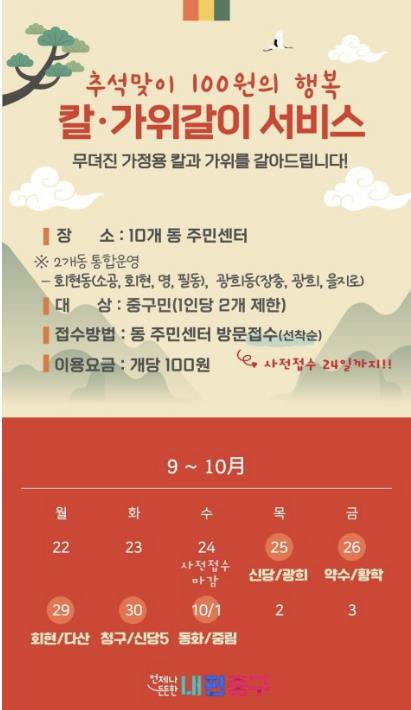 지난 설 명절에는 중구자원봉사센터가 무료 칼갈이를 운영한 바 있다. 당시 주민들은“덕분에 명절 음식 준비를 수월하게 잘했다”, “집이랑 가까운 곳으로 찾아와줘 편리했다”등 만족감을 나타냈다. 그 호응에 힘입어 이번에는 중구가 추석 명절 칼갈이를 이어간다.