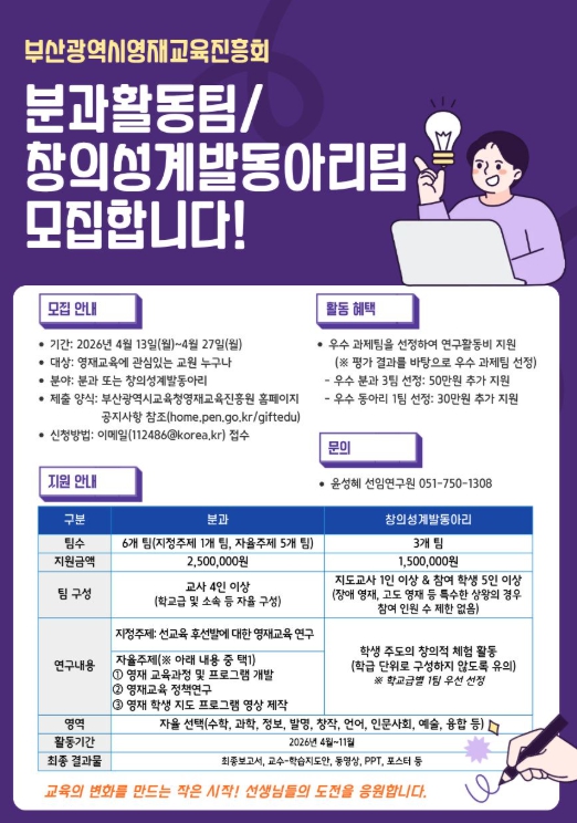 [뉴스앤톡] 부산광역시교육청영재교육진흥원은 오는 27일까지 영재교육에 관심 있는 교원을 대상으로 ‘2026년도 영재교육진흥회 연구과제 팀’을 공개 모집한다.