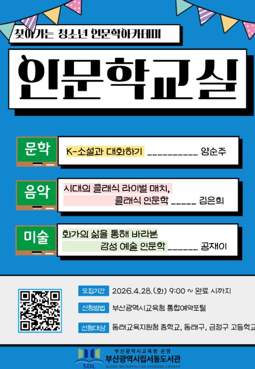 [뉴스앤톡] 부산광역시교육청서동도서관은 오는 5월부터 11월까지 동래교육지원청 관내 중학교와 고등학교(동래구, 금정구)를 대상으로 ‘찾아가는 청소년 인문학 아카데미’를 진행한다.