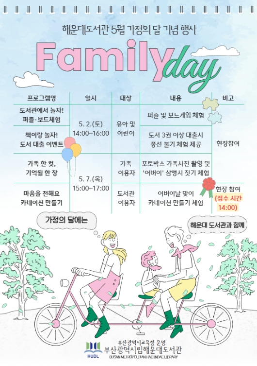 노장석 해운대도서관장은 “가정의 달을 맞아 가족이 함께 참여할 수 있는 다양한 체험 프로그램을 준비했다”며 “도서관에서 즐거운 추억을 만들고 책과 함께하는 따뜻한 시간을 보내시길 바란다”고 말했다.