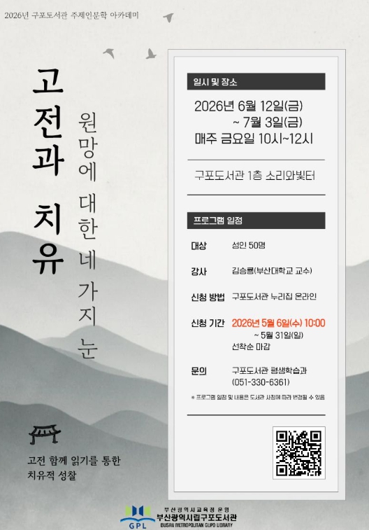 [뉴스앤톡] 부산광역시립구포도서관은 오는 5월 6일부터 7월 3일까지 도서관에서 성인 80명을 대상으로 ‘2026년 상반기 주제인문학 아카데미’를 운영한다.