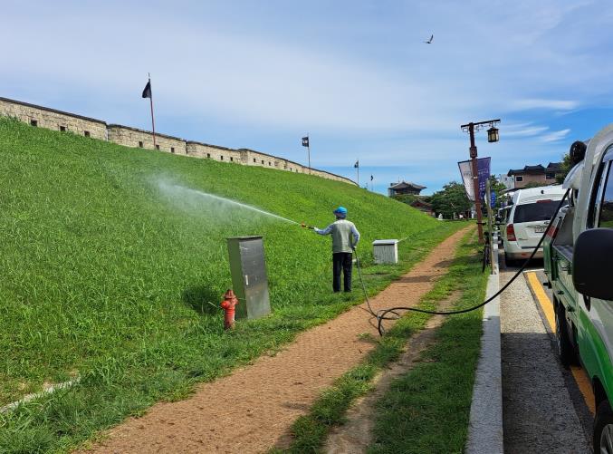 | ▲ 팔달구 보건소 관계자가 23일 수원화성 일대에서 방역특장차를 활용해 방역을 하고 있다. |