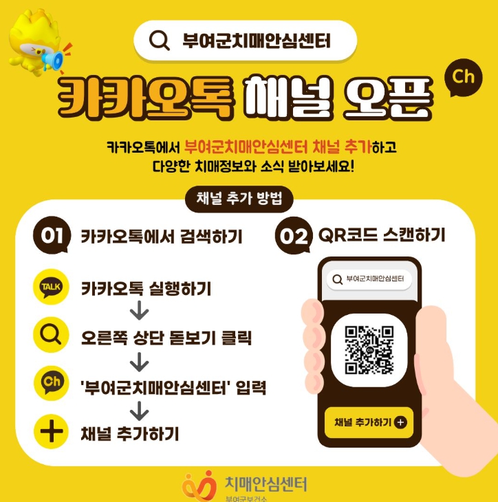채널 이용은 카카오톡에서 ‘부여군치매안심센터’를 검색하거나 QR코드를 스캔하여 채널을 추가하면 이용할 수 있다.