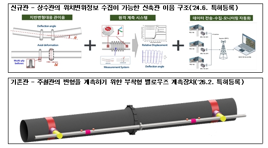 새로운 관로를 매설하면서 신축관을 활용해 센서를 부착하는 ‘상수관의 위치변위정보 수집이 가능한 신축관 이음 구조’와 기존 매설돼 있는 관로 중 일부 침하가 예측되는 구간만 집중 관리할 수 있도록 고안한 ‘주철관의 변형을 계측하기 위한 부착형 벨로우즈 계측장치’ 2가지이다.