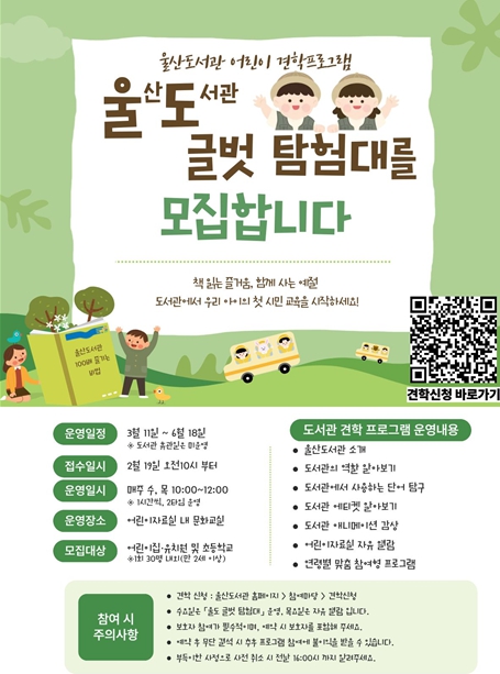 울산도서관 관계자는 “어린이들이 도서관을 단순히 책을 빌리는 곳이 아닌 즐거운 탐험의 공간으로 인식할 수 있도록 다채로운 프로그램을 진행할 예정”이라며 “지역 내 유치원·어린이집 및 초등학교의 많은 관심과 참여를 바란다”라고 말했다.