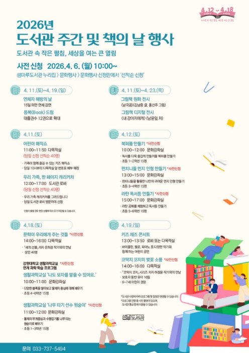[뉴스앤톡] 원주시 샘마루도서관은 ‘도서관 주간 및 책의 날’을 기념해 4월 11일부터 23일까지 작가 강연, 공연, 체험, 전시 등으로 구성된 다양한 문화 행사를 개최한다.