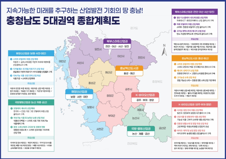 이에 따라 연구는 충남을 ▲북부스마트산업권 ▲해양신산업권 ▲충남혁신도시권 ▲국방·웰빙산업권 ▲K-바이오산업권 등 5대 권역으로 구분했다.