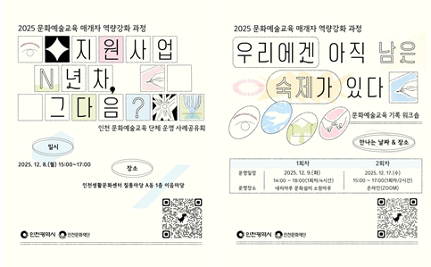 [뉴스앤톡] 인천광역시와 (재)인천문화재단은 인천 지역에서 활동하는 문화예술교육 매개자의 전문성 향상과 지속가능한 활동 기반을 위해 '2025 문화예술교육 매개자 역량강화 과정'을 오는 12월 8일부터 17일까지 운영한다.