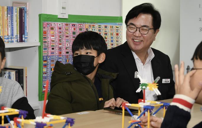 ▲ 박일하 동작구청장이 지난해 12월 서울 동작구 사당3동 우리동네키움센터에서 ‘AI 로봇 발명 메이커 대회’ 수상 아동들과 대화를 나누고 있다.