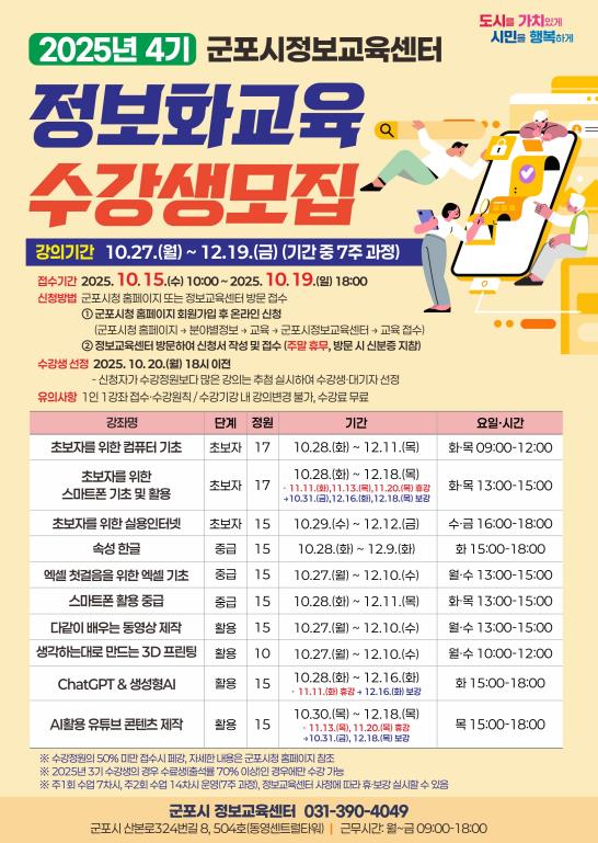 수강신청은 2025년 10월 15일 오전 10시부터 10월 19일 오후 6시까지 가능하며, 군포시청 홈페이지 또는 군포시 정보교육센터(산본로324번길 8, 504호, 주말 휴무) 방문을 통해 신청할 수 있다.