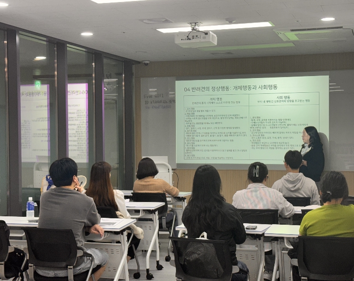| ▲ 올해 4월 청년 배움에서 반려동물 행동지도사2급 기초이론과정 수업을 진행중인 모습 |