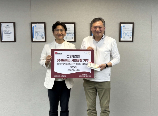 [뉴스앤톡] 서천군 장항국가생태산단 입주기업인 ㈜토비스(대표이사 하희조·김용범)가 지난 16일 지역 어르신들을 위해 ‘2026 태안 국제 원예치유 박람회’ 입장권 100매를 대한노인회 서천군지회(지회장 김윤태)에 기탁했다.