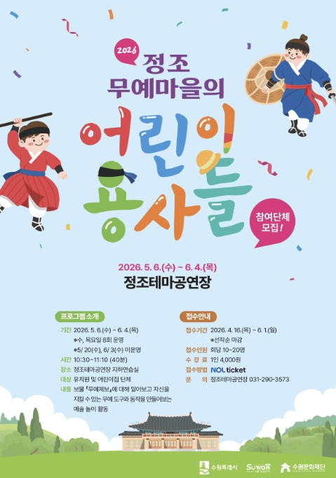 이번 교육은 수원문화재단 2기 유아동 예술교육가로 활동 중인 이현지 강사가 진행하며, 놀이와 신체활동을 중심으로 아이들이 자연스럽게 수원의 역사와 전통을 이해하고 창의적으로 표현할 수 있도록 도울 예정이다.