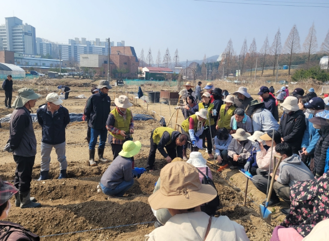 센터는 올해 선발된 교육생 100명과 함께 개별 텃밭에 씨앗과 모종이 잘 자랄 수 있도록 이랑을 조성하는 두둑을 만들고, 지온 유지를 위한 멀칭 비닐을 씌운 후 감자와 완두 심기를 실습했다.