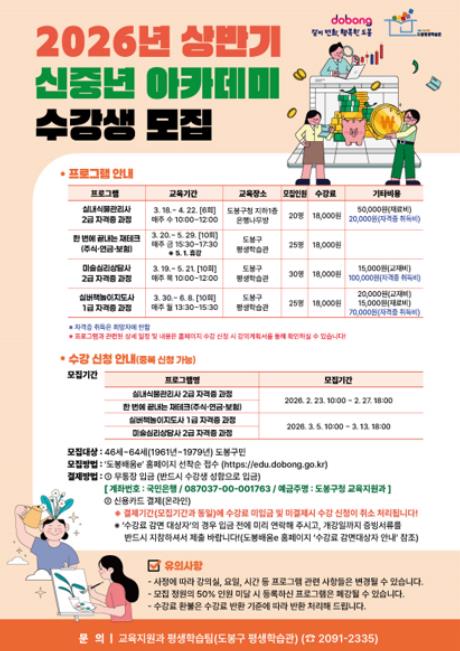 [뉴스앤톡] 서울 도봉구가 2026년 상반기 신중년 아카데미 수강생을 모집한다. 이번 상반기는 신중년들이 제2의 인생을 준비할 수 있는 인생재설계 과정과 직업 역량 강화를 위한 강의로 구성된다.