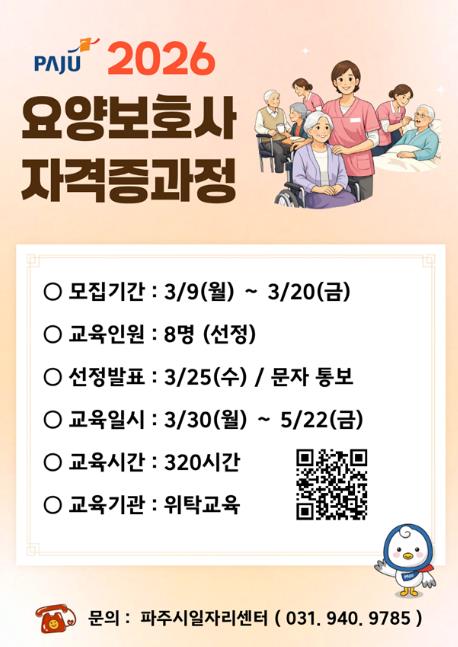 모집 기간은 3월 9일부터 3월 20일까지이며, 신청 대상은 요양보호사로 취업을 희망하는 파주시 거주 구직자다.