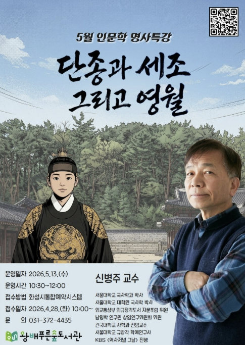 [뉴스앤톡] 화성시문화관광재단 운영하는 왕배푸른숲도서관이 오는 5월 13일, 지역 주민들을 위해 역사학자 신병주 교수를 초청하여 5월 인문학 명사특강을 개최한다.