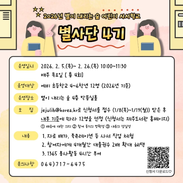 [뉴스앤톡] 제주도교육청 제주도서관은 어린이들이 사서 직업을 직접 체험하며 도서관의 역할과 가치를 이해할 수 있도록 2026년 별이 내리는 숲 어린이 사서 학교 ‘별사단 4기’를 운영한다.