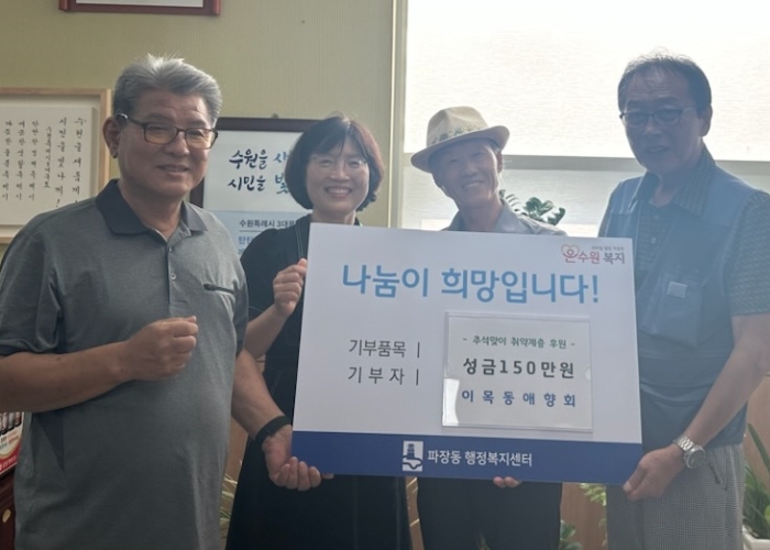 [뉴스앤톡] 수원시 장안구 파장동은 지난 18일, 이목동 애향회에서 추석을 맞이하여 홀로 계신 어르신과 저소득 취약계층 등 소외된 이웃들에게 힘이 되고자 성금 150만원을 기부했다고 밝혔다.