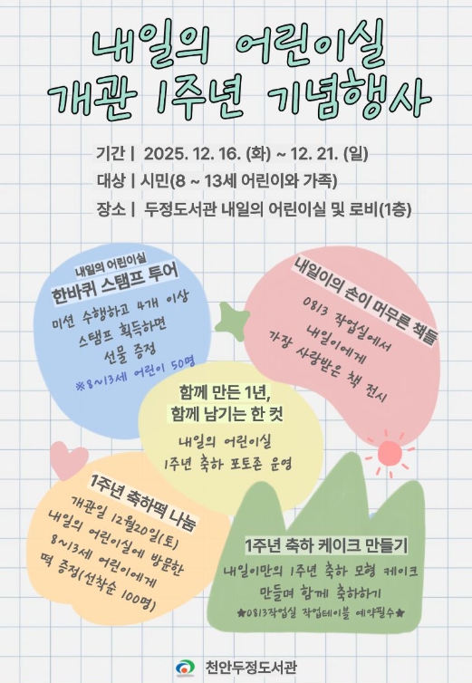 [뉴스앤톡] 천안시 두정도서관은 오는 16~ 21일 ‘내일의 어린이실’ 개관 1주년 맞아 다채로운 기념행사를 운영한다고 15일 밝혔다.