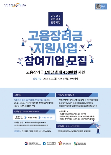 [뉴스앤톡] 인천광역시와 인천관광공사(사장 유지상)는 지역 중·소 관광기업의 안정적인 인력 운영을 지원하고, 인천 거주 청년의 지속 가능한 일자리 창출을 위해'2026년 인천 중·소 관광기업 고용장려금 지원사업'을 추진한다고 밝혔다.