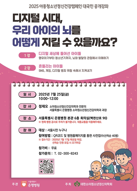 [뉴스앤톡] 서울시 은평병원은 7월 25일 오전 10시부터 은평병원 본관 6층 회의실에서 ‘디지털 시대, 우리 아이의 뇌를 어떻게 지킬 수 있을까요?’라는 주제로 2025년도 아동청소년 정신건강캠페인 대시민 공개강좌를 개최한다고 밝혔다.