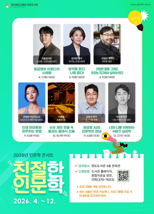 [뉴스앤톡] 경상북도교육청 청도도서관은 2026년 인문학 콘서트 ‘친절한 인문학’을 4월부터 12월까지 총 7회에 걸쳐 운영한다고 밝혔다.