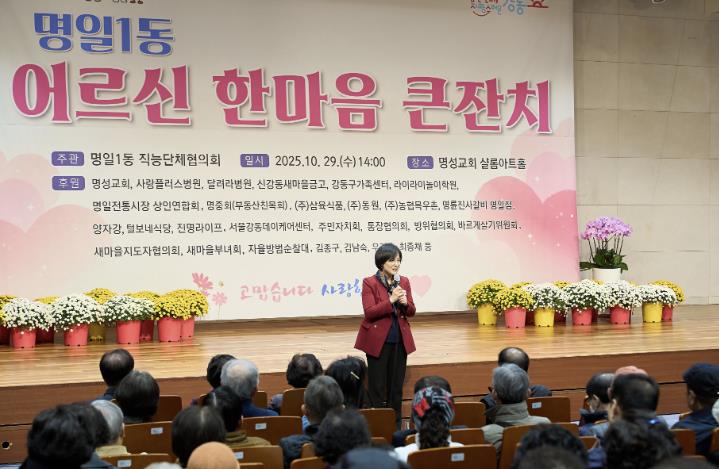 [뉴스앤톡] 서울 강동구 명일1동은 지난 10월 29일 명성교회 샬롬아트홀에서 관내 어르신 250여 명을 모시고, ‘명일1동 어르신 한마음 큰잔치’를 성황리에 개최했다고 밝혔다.