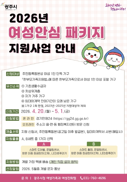 신청 대상은 광주시에 주민등록을 둔 여성 1인 가구와 여성 1인 이상이 포함된 한부모 가족이며, 신청 기간 내 ‘경기민원24’를 통한 온라인 접수 또는 주소지 담당 행정복지센터 방문을 통해 신청할 수 있다.