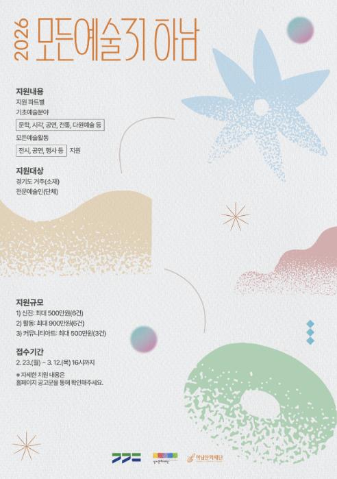 2026 경기예술활동지원 ‘모든예술31’은 경기도 31개 시·군의 지역 예술 생태계 활성화를 위해 추진되는 사업으로 기초예술분야(문학·시각·공연·전통 등)의 다양한 예술 활동을 폭넓게 지원한다.