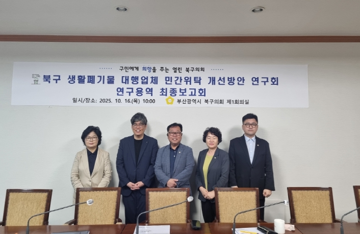 [뉴스앤톡] 부산광역시 북구의회 의원연구단체 ‘북구 생활폐기물 대행업체 민간위탁 개선방안 연구회’(대표의원 임성배)가 10월 16일 오전 10시,‘북구 생활폐기물 민간위탁 개선방안 연구용역’최종보고회를 개최했다.