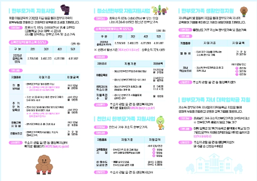 이 외에도 △자녀학습비 및 월동비 지원 △취약·위기가족 사례관리 △한부모가족복지시설을 통한 보호 및 자립 지원 등 천안시와 정부가 추진하는 주요 복지 정보가 수록됐다.